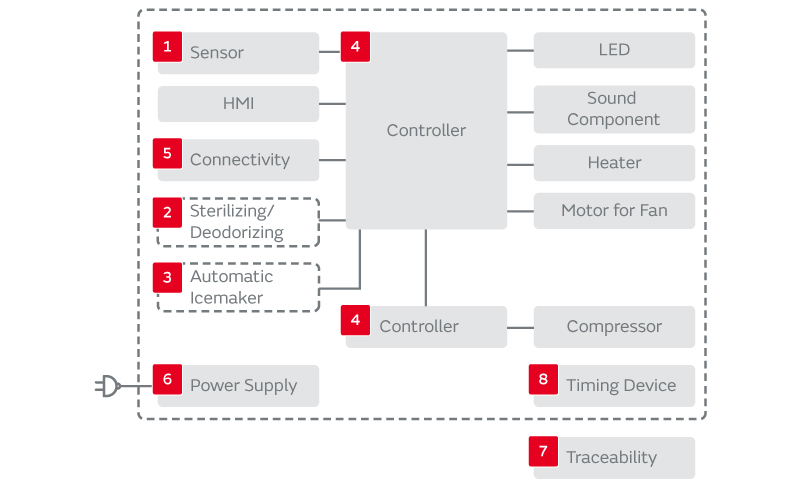 空调设备、冰箱、洗衣机等日常生活中的家电产品,越来越注重节能、环保及有利健康的方面。村田公司提供低损耗、耐久的陶瓷电容器,高转换效率电源模块为节能做出贡献。提供进行空气净化的负离子发生器,具有杀菌、除味、保持蔬菜新鲜度和营养的活氧发生器。也为智能家电提供这种传感器、无线通信模块、微型计算器周边部品,为人类与地球做出贡献。