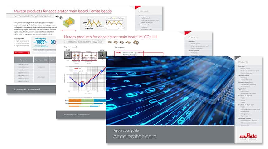 This summary provides a detailed overview, not only of the challenges and the surrounding environment in the Accelerator card market but also of Customer's Solution and Technical Trends, including Package design and Main board PDN design. Additionally, it offers a comprehensive explanation of Murata's Product Lineup, detailing specifications and features, and providing direct links to Murata's product library for more information. It also introduces a range of services, such as the EMC Evaluation Service, information about facilities, and our production bases, all aimed at enhancing our offerings to meet your needs effectively.