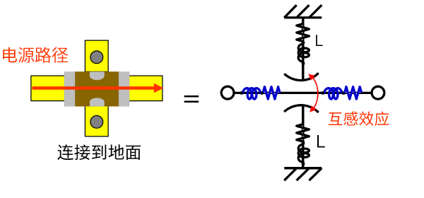 如果接地孔不在NFM的左右两侧,而是在正下方,除了左右电流的相互感应效应外,还会产生如右图所示的上下电流相互感应效应、从而使该区域的ESL进一步减小。