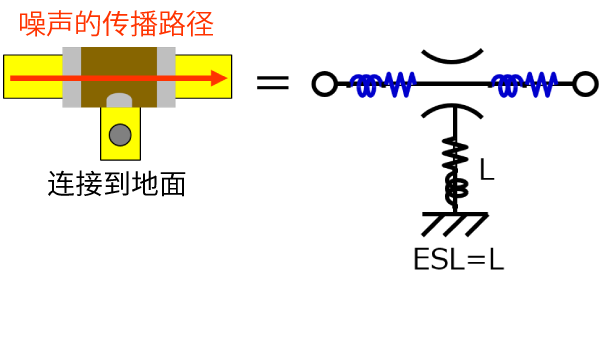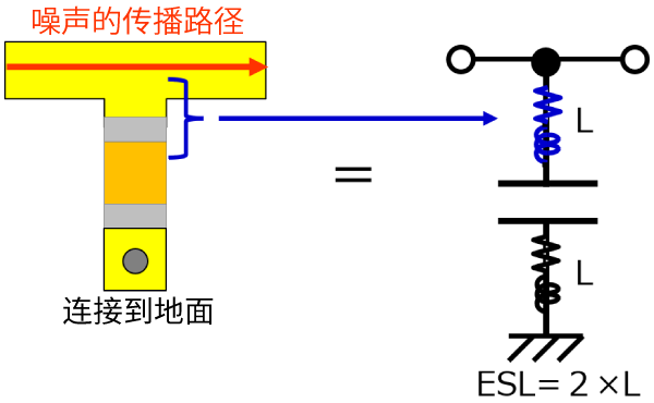 3端子电容通过其电极结构,能够将噪声旁路路径的电感的一半转换为与噪声路径串联的方向,从而实现将电容器本体或安装焊盘产生的电感减半的效果。(插入损耗可降低6dB)