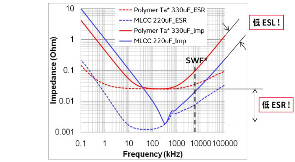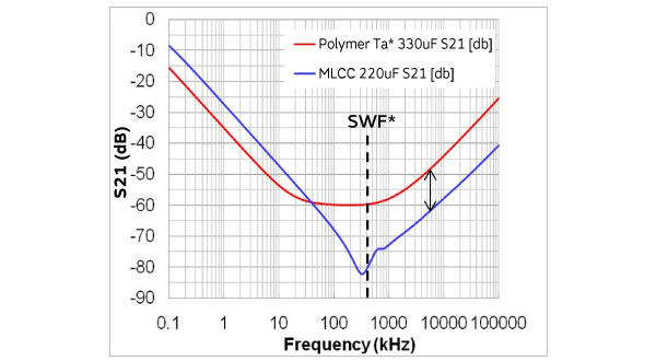 S21低于聚合物电容器。 →纹波和尖峰噪声可以进一步降低。