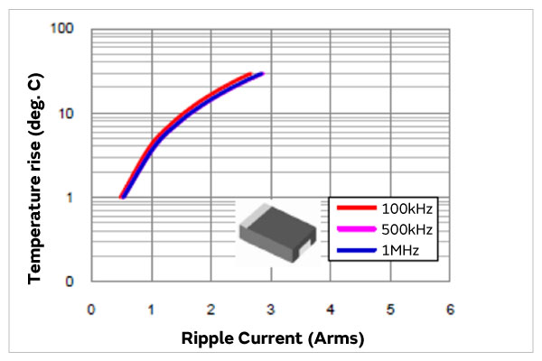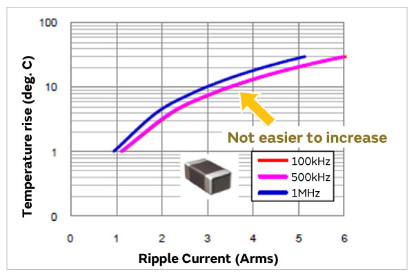 MLCC的温升斜率比聚合物电容器的温升斜率更小。 →使用寿命长,可靠性高。