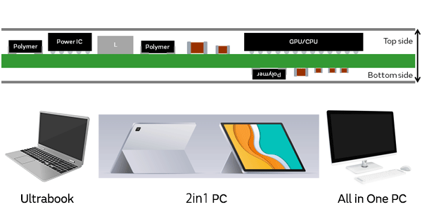 由于ECAS系列比铝电解电容器(绕组型)更薄,因此有助于设备的薄型化。