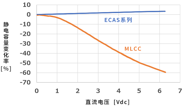 MLCC使用基于钛酸钡的强介质,向电容器施加直流电压时,有效静电容量会发生变化(降低)。 另一方面,在ECAS系列中,几乎不会发生这种静电容量变化。 因此,使用时不需要担心因施加电压而引起的静电容量变化。