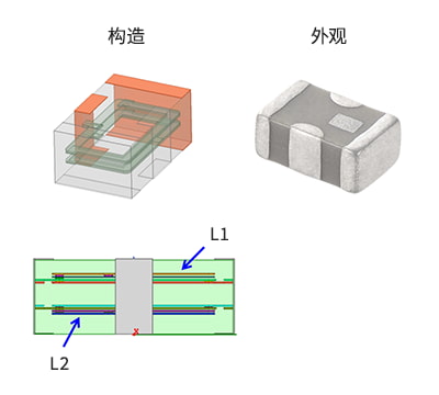 去寄生电感降噪元件(LCT)在元件内部内置两个线圈。通过使这两个线圈靠得很近,成为相结合的变压器构造,从而在两个线圈的中间部分产生负互感(−M)。利用村田制作所的陶瓷多层技术,这负互感实现了高精度的稳定的M值。