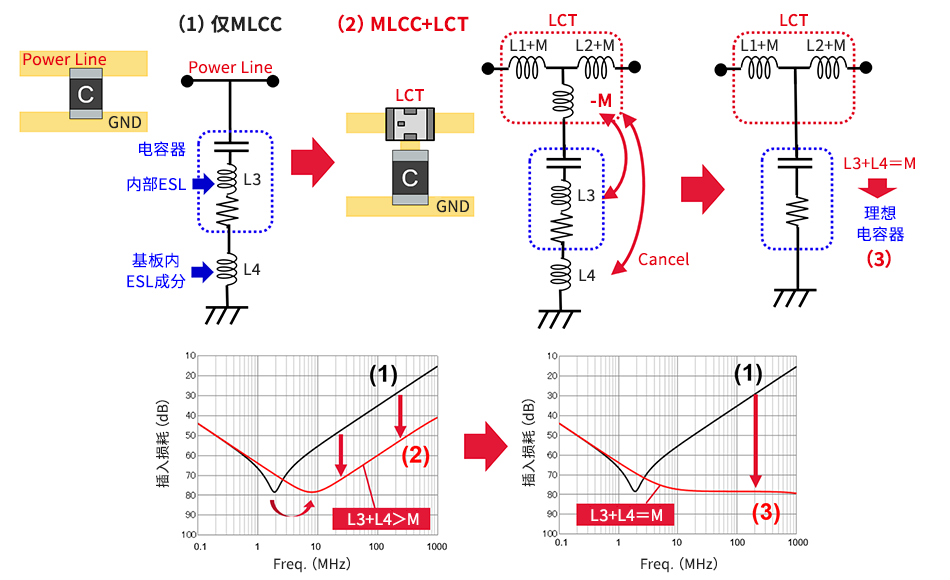 通过连接LCT,在比MLCC的自振频率高的频带插入损耗变大。从而对由DC-DC转换器等引起的电源线上的数MHz~1GHz的高次谐波噪音,具有出众的遏制效果。