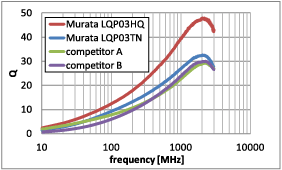 图2: 0603尺寸、LQP03TN系列与同行业叠层型产品的 Q值特性比较 (均为10nH)