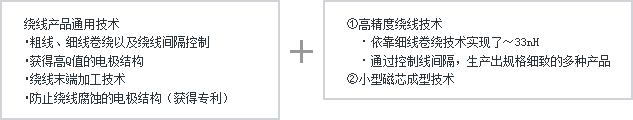 高频绕线产品的通用技术加上高精度绕线技术、小型磁芯成型技术,实现了小型化。