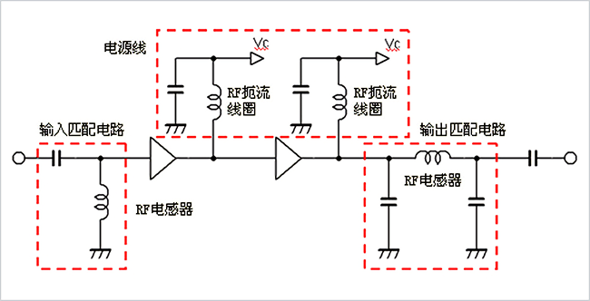 为了达到阻止 (扼流) 交流 (信号或噪声) 、只通过直流的目的,PA的电源线采用扼流线圈。如果扼流线圈出现电压下降,就会影响PA特性,因此希望电感器的直流电阻尽可能小。一级的输出功率较小,因此流过扼流线圈的电流较小; 随着后一级输出功率的增大,流过扼流线圈的电流将增大。