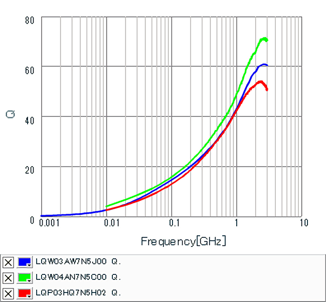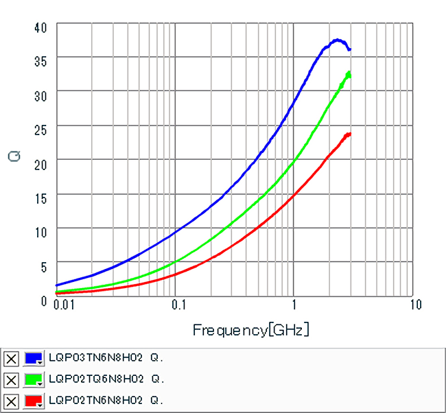 图2为LQP02TQ_02/LQP02TN_02/LQP03TN的Q (均为6.8nH) 对比图表。此图表是采用了前面介绍的SimSurfing 在新窗口中打开 表示的。