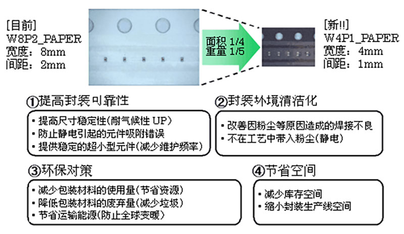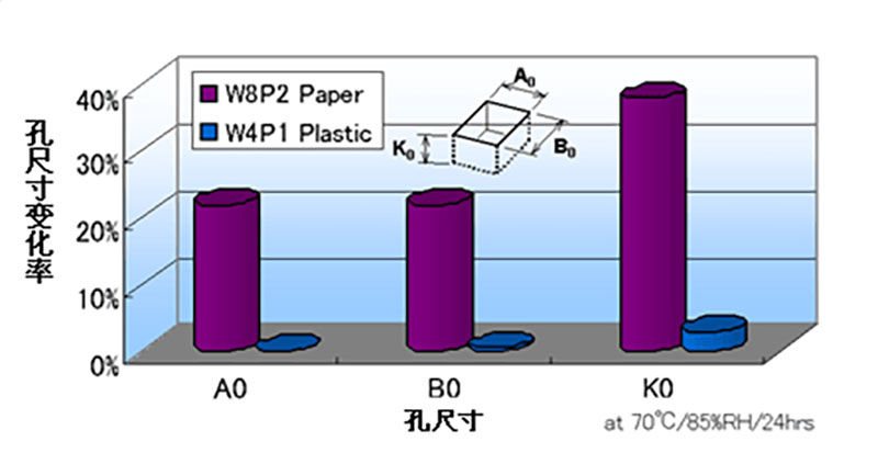 但是,使用纸质编带时,孔的大小会随着运输、保存时的湿度变化而变化。随着元件尺寸越来越小,这种影响也将越来越大,甚至极有可能在窄邻接封装和高可靠性封装面上无法获得原有的封装品质。