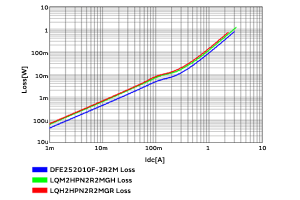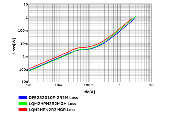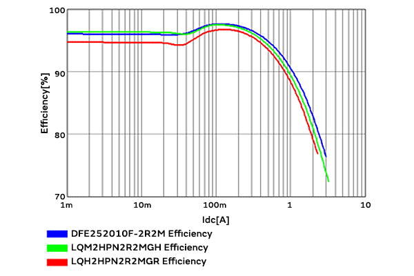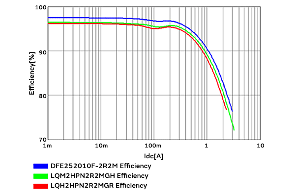 横轴表示输出的直流电流Idc[A],纵轴表示效率[%]。从本结果可以看出,DFE252010F在2MHz时效率更高,而LQM2HPN在6MHz时效率更高。