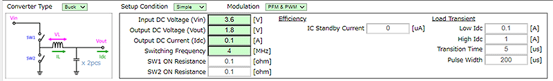 DC-DC转换器动作条件设定表格:显示例)Vin:3.6V,Vout:1.8V,频率:2MHz,Idc Max:2A