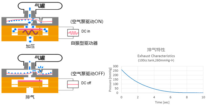 除泵功能外,它还具有被动式阀门功能,在正压力下驱动停止时,排气开始。在加压时和排气时的空气流动路径会发生变化。