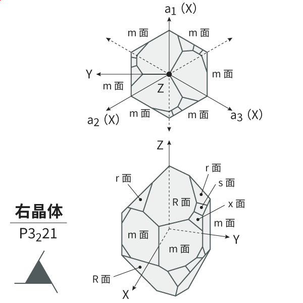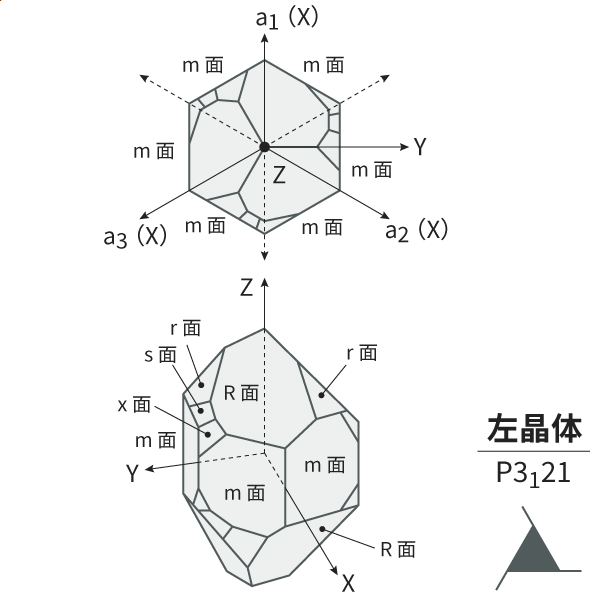 晶体的化学分子式是SiO2,它是三方晶系的结晶。顺便说一下,化学分子式同为SiO2的石英玻璃为非晶态。 晶体是一种典型的压电材料,对其施加压力时会产生电。此外,它是极性压电结晶,不是强介质。因此不需要像压电陶瓷那样进行极化处理(调整电荷的极性)。 它在光学上是一种具有双折射的结晶,大量用作波长板的材料。