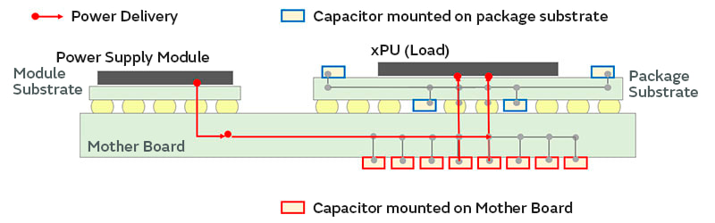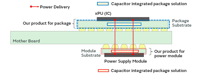 为了减少高性能半导体的功率损耗,缩短从大电流流经的电源模块到IC之间的布线距离并减少布线损耗是一种有效的方法。Integrated Package Solution能在电路板中内置大容量电容器,因此可以设计电源线路布线距离超短的“垂直电源供电”,从而帮助减少功率损耗和实现能源节省。