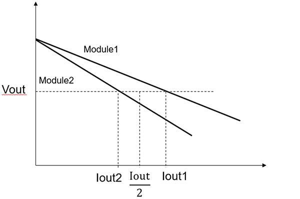 图2为基于下垂特性的电流共享概略图。图2表示并联了2个电源模块时的输出电压与输出电流(IOUT)的关系。图2的Module1和Module2的斜率根据上述公式所示的ROUT及各模块的布线布局发生变化。由该斜率决定各模块之间流过的电流。如果两个模块的ROUT及布线阻抗、模块温度一致,则各模块流过输出电流的一半(IOUT/2)电流。另一方面,在下垂斜率存在差异时,如图2所示,Module1流过IOUT1的电流,Module2流过IOUT2的电流,成为IOUT1>IOUT/2>IOUT2的状态。但是,由于Module1相较Module2流过的电流大,因此损耗增大会引起发热。由于模块温度上升使ROUT增加,Module1的电流会减少。因此,Module1和Module2的电流会自动进行电流平衡,使差值变小。