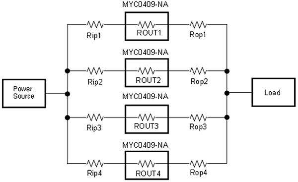 图3表示搭载了MYC0409-NA的系统的电阻成分等效电路图。图3为并联了4台模块的图示,ROUT*为各模块的ROUT。