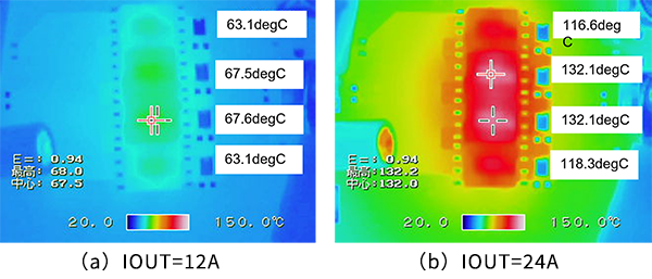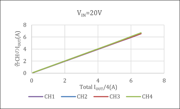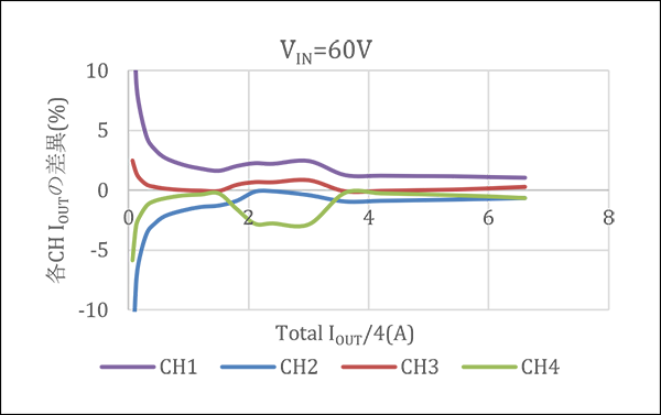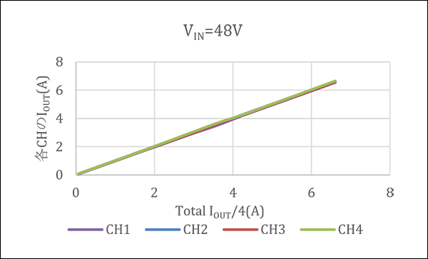 图9表示温度特性。本评估的温度为TA=25degC,在自然空冷的条件下实施了评估。在本次测量中,由于未使用散热器进行散热,中间2台难以散热的模块温度上升。假设从图5的CH1或CH4强制实施空冷,安装在风扇一侧的模块温度将会下降,电流更易流过。由于强制空冷可能导致模块之间的电流共享变差,因此强制空冷时应注意风扇的方向。