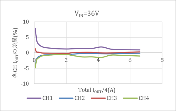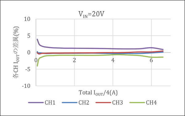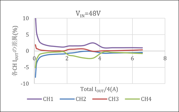 图7表示各输入电压下的电流共享,图8表示与各输入电压下均等共享电流状态(IOUT/4)的电流差异。结果表明:在超过负载电流IOUT=1A的范围,实现了±3%以下的良好电流共享。由于轻负载时电流值低,难以校正温度,因此各模块之间容易出现电流值差异,而测量环境是造成差异的影响因素之一。电流增幅的运算放大器的偏置及测量仪器的精度等,提高轻负载时的测量精度的测量方法,是今后我们应解决的课题。