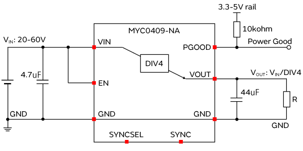 MYC0409-NA为48伏、4分割充电泵,电容器分配器全集成模块。 可提供功率高达72瓦,峰值效率97%。 MYC0409设备可以并联,以提供高功率、效率出众的解决方案,适用于多种48V至12V的降压转换应用,如数据中心、网络路由器、基站和光学设备等。