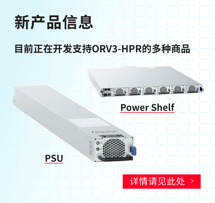 • 支持多种规格:备有符合ORV2、ORV3和ORV3-HPR标准的PSU和电源架,可为高负载设备提供稳定的电源供给