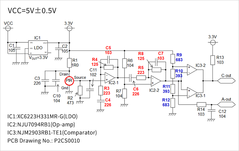 *如需调整阀值电平,请更改电路图中以蓝字表示的成分值(R9、R10、R11、R12)