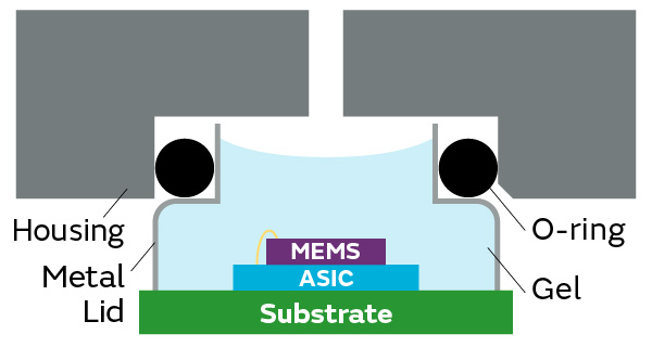 村田的防水型气压传感器可以O型圈嵌合外壳。 此外,以金属帽包覆MEMS及ASIC等元件,内部采用以凝胶保护的结构,实现了卓越的防水性能。 MEMS可经由凝胶与外部环境接触测量气压。