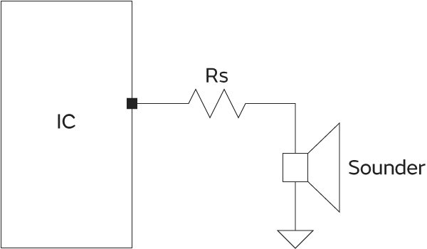 压电扩音器根据从IC输入的信号进行驱动,从而进行鸣动。因此,鸣动频率和声压级根据从IC输入的信号的频率和电压而变化。图1是用IC直接驱动扩音器的电路示例。