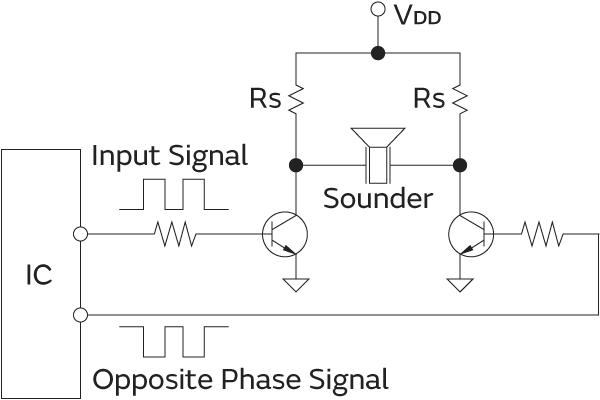 图3显示了BTL(Bridge Tied Load)电路的示例,该电路将来自IC的正相和负相信号分别输入到压电扩音器的每个端子。如图所示,通过从IC的一个端子输入正相信号,从另一端子输入负相信号到压电扩音器,有望获得2倍于图1电路的声压级(+6dB)。