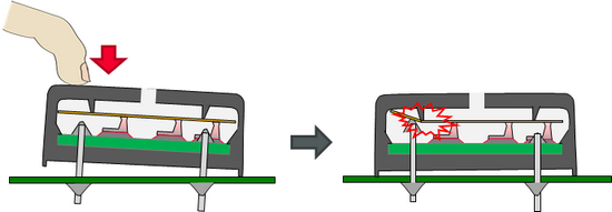 因为是这样的构造,所以一旦将塞入产品内部的力施加到外部端子上,就有可能发生以下不良情况。