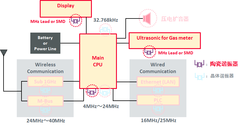 在多种智能仪表(电力、煤气、热量、自来水)中配置的显示器和超声波流量传感器、微型计算机中使用了“陶瓷谐振器”,在有线和无线通信使用的IC中使用了“晶体谐振器”,在数据读写确认声音装置中使用了“压电扩音器”。