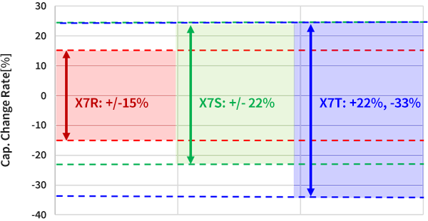 从EIA标准规定的电容变化率来看,在工作温度范围内,电容变化率按 X7R<X7S<X7T 的顺序变大。