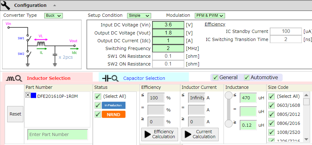 显示用于直流-直流(DC-DC)转换器电路的最佳功率电感器和独石陶瓷电容器的型号