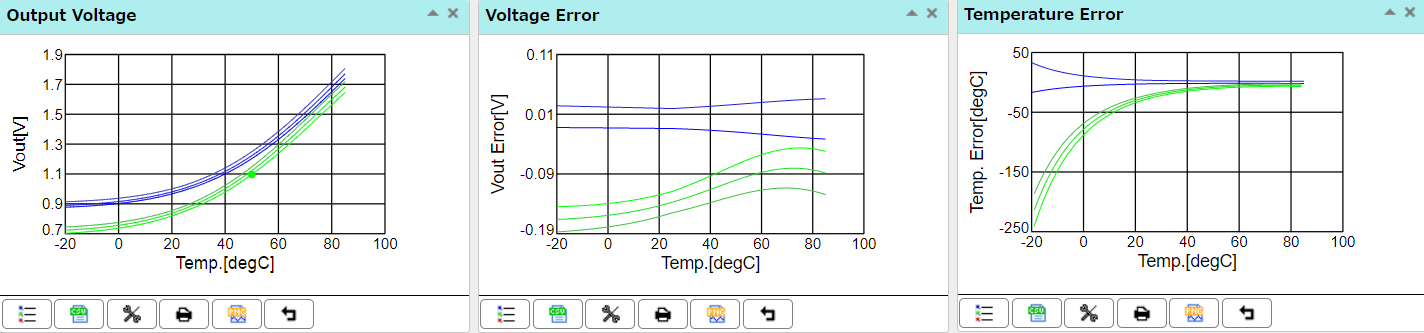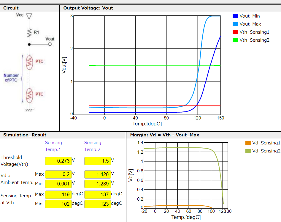 可以针对正温度系数(PTC)热敏电阻和电阻器的接地电路仿真输出电压-温度特性。
